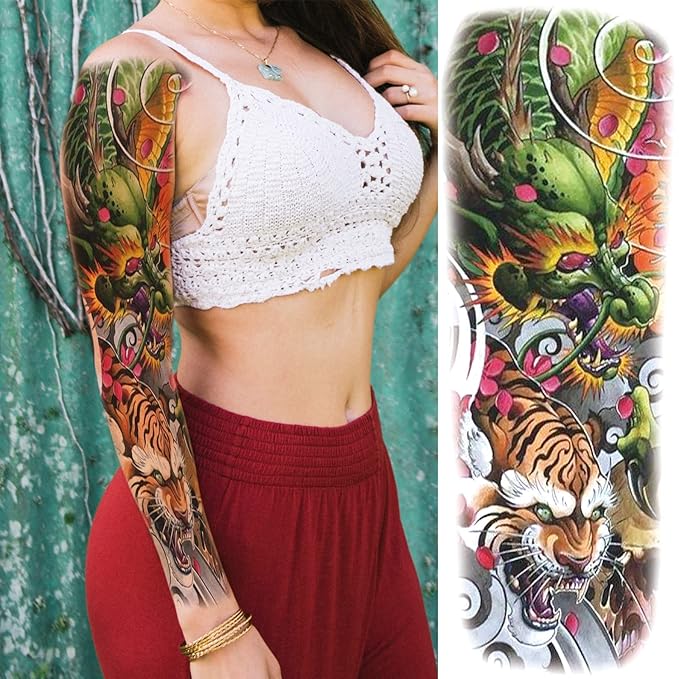 - ✔[LONG LASTING & WATERPROOF] Large Color Full Sleeve Fake Tattoos That Looks Real And Last Long For 3-7 Days Durable Fashion Designs DIY Customized Creative Temp Tattoos For Men Women Adult Realistic Dragon Flower Fish Tiger Floral Color Theme Tatuajes Temporales Men Woman Para Resistentes Al Agu