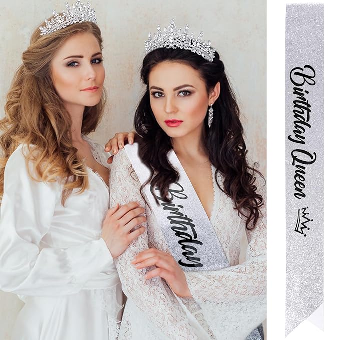 VELSCRUN Silver Crystal Birthday Queen Tiara Crowns for Women Girls Birthday Queen Headband Sash Elegant Princess Crown with Combs Hair Accessories Happy Birth Party Decorations Mom