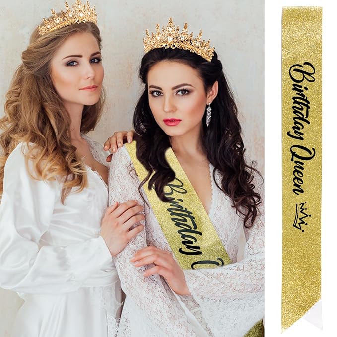 Velscrun Gold Crystal Birthday Queen Tiara Crown for Women Girls Birthday Queen Headband Sash Elegant Princess Crown with Combs Hair Accessories Happy Birth Party Decorations Mom Birth Gift