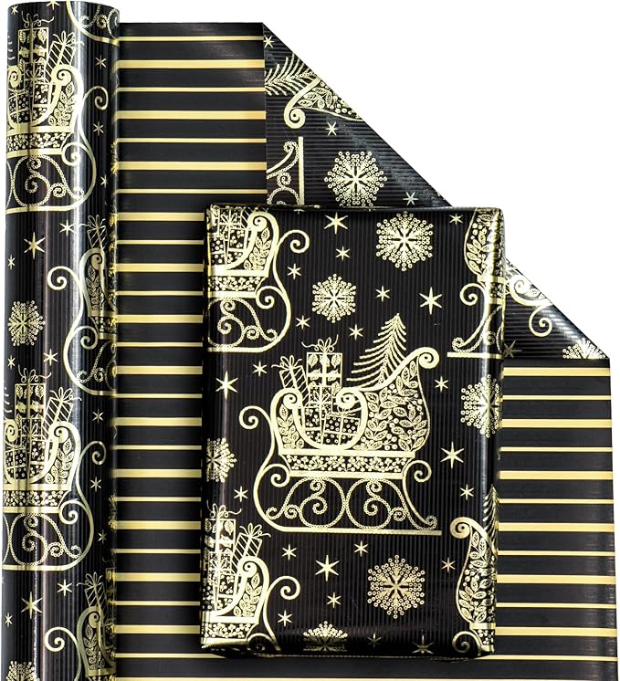 WRAPAHOLIC Reversible Black and Gold Christmas Wrapping Paper - Mini Roll - 17 Inch x 33 Feet - Black Gold Sleigh and Stripe Wrapping Paper with Metallic Foil Shine for Christmas, Holiday, Party