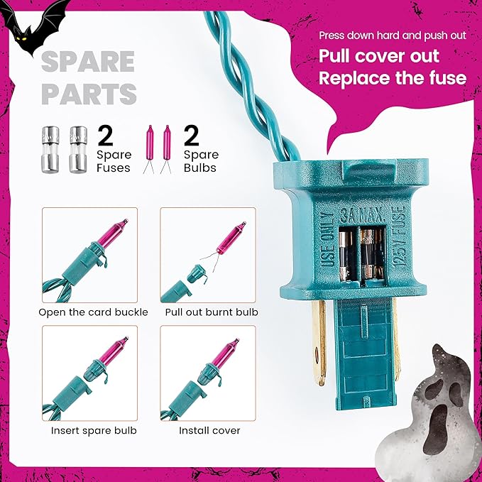 - 🎆Unique Design Halloween Lights: The bulb has a snap-on design and is very easy to replace. When one of our bulbs breaks, it doesn't affect the other bulbs. This is a very special design. You can replace damaged bulbs individually with the spare bulb or fuse provided by us.