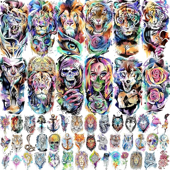 - đă55 Sheets Watercolor Temporary Tattoos For Women Men Kids Adultsă--VANTATY 3D Realistic Animals Temporary Tattoos For Adults Women Kids Men Adults Girls Body Art Stickers Look Real! ăClick Our Store/Brand Name To See More Fashion Designsă3D Vivid Vintage Leopard Peony Floral Snake Wolf Tiger Lion Cross Mountain Tribal Eye Owl Halloween Skull Skeleton Arrows Anchor Gangster Butterfly Fox Compass Feather Birds Water Color Tattoos Dreamcatcher.
