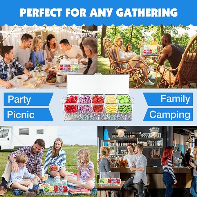 - 【EASY REFILL & CLEAR VISIBILITY】: The ice condiment server caddy features removable compartments for effortless condiment refilling. the transparent design of the chilled condiment server lets you monitor ice and food levels at a glance.