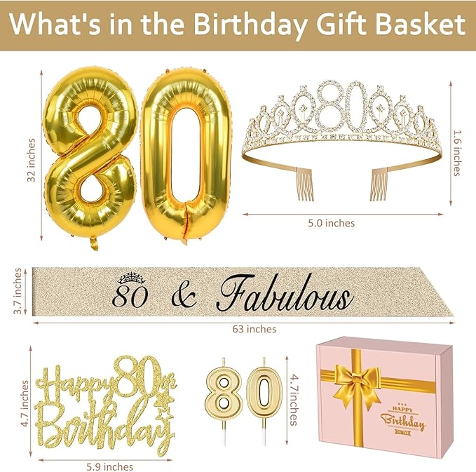 - [80 Birthday Decorations Gold Set]: Package Coming with Glittery Rhinestone 80th Birthday Tiara/Crown x 1pc, Gold 80th Birthday Sash x 1pc, Happy 80th Birthday Cake Topper x 1pc, Number 80 Candles x 1set, Big Gold Numeral 80 Balloons x 1 set, Birthday Card x 1pc. This great valuable 80th birthday gift for women gold has been packed in a beautiful gift box for ready presentation