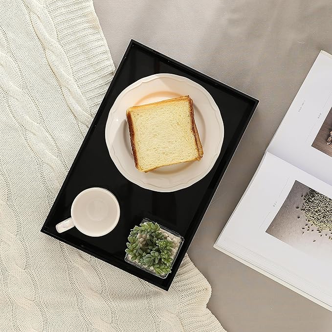 - MULTI-PURPOSE: This Clear Acrylic Serving Tray is a multi-purpose necessity for any home and an ideal decorative companion for your ottoman and coffee table. With handles on the side,the tray is easier for serving meals,snacks,offee,drinks,desserts,serving breakfast in bed, arranging toiletries and cosmetics on a bathroom vanity, storing remote controls in the living room, and turning your sofa into a cozy workstation.