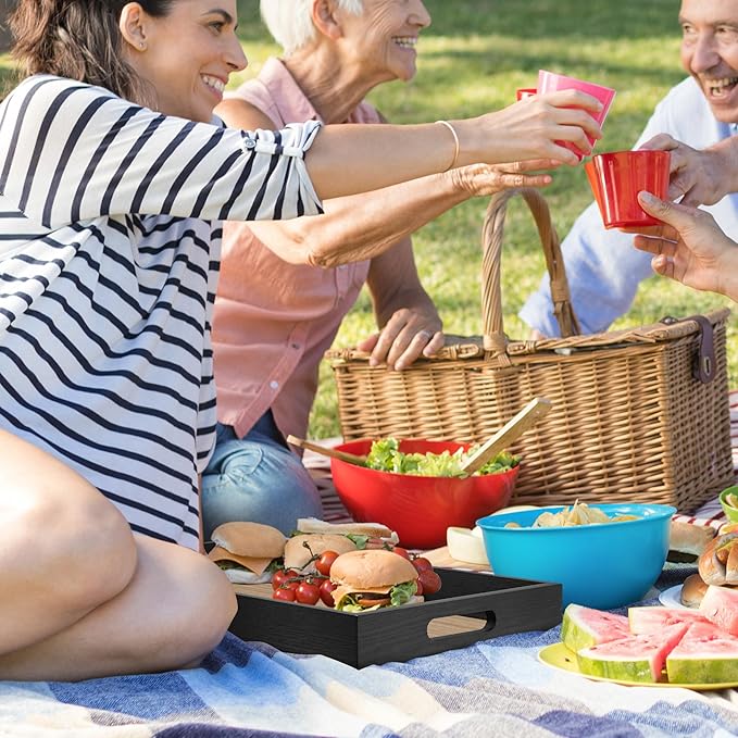 Wood Serving Tray with Handles, Home Decorative Wooden Rectangle Ottoman Decor Platter Vanity Tray for Breakfast Dinner Drinks Kitchen Dining Living Bathroom Restaurants Black Wooden
