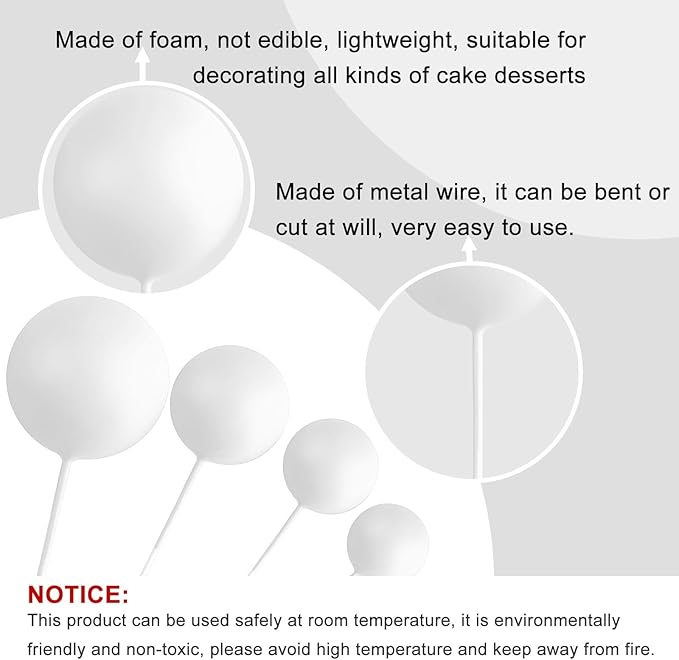 - Material: these ball decorations for cake are made of foam and wire. Safe to decorate food at room temperature, such as cake or dessert decorating use, or cupcakes, fruits, cheese and any dish and appetizer you want to decorate.