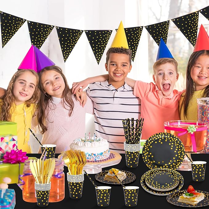 - 【Gold foil dot design】With an elegant black color background and eye-catching gold foil dot pattern design, our party supplies add a classy and modern touch to any occasion. Perfect for gold-themed parties and events.