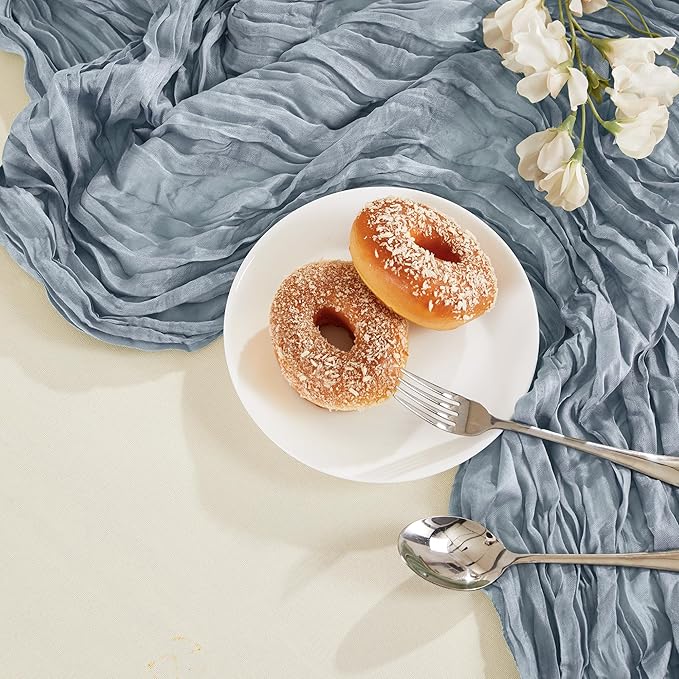 - PACKAGE INCLUDED: You will receive 12 pieces of dusty blue cheesecloth table runners. Elegant and beautiful design, exquisite workmanship. Product size: Each boho table runner is 35 x 120 inches. Enough to cover rectangles and round tables, as well as long tables that are stitched together. It can even be used to belt chairs decorate napkins, background curtains. Round or square tables for 8-10 people, perfect for romantic and elegant party events