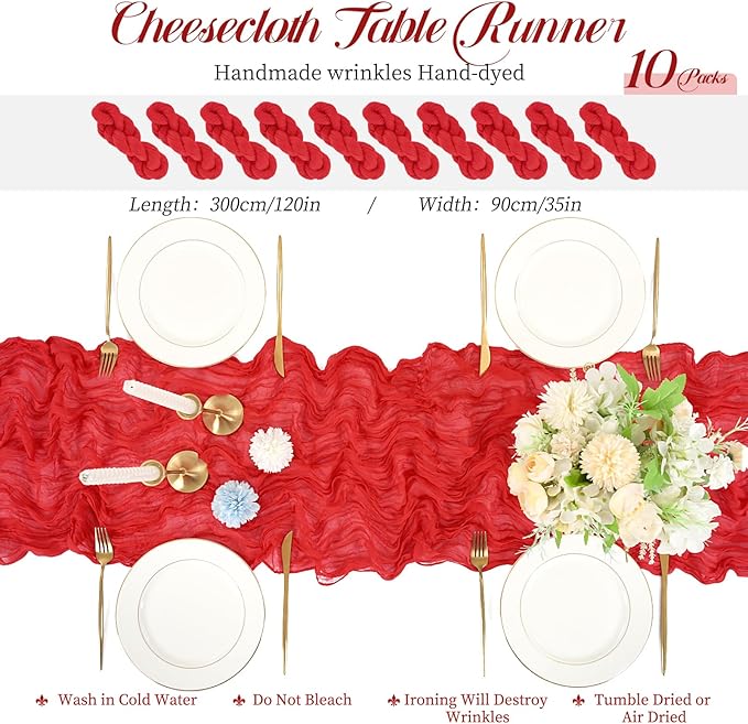 10 Packs Cheesecloth Table Red, 10Ft x 35" Rustic Gauze Boho Wedding Table Runner Decoration, Wedding Table Decor Table Cloth for Wedding Party Bridal Shower Table