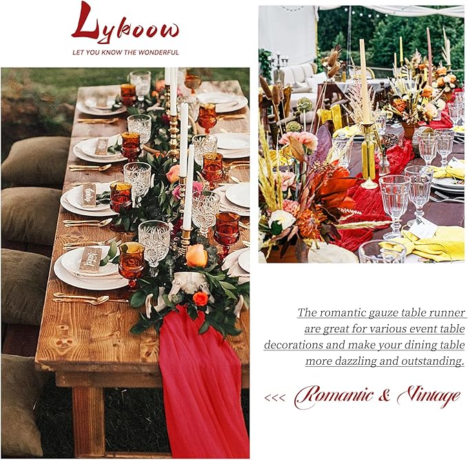 - 【Versatile Cheesecloth Table Runner】- This handmade dyed luxury cotton gauze tablecloth runner has a rustic and elegant look.The cheesecloth runner with gorgeous folding edge design creating a vintage elegant home decorations.Great for wedding decorations, outdoor/indoor wedding receptions, rustic country wedding, bridal shower, engagement banquet, birthday parties, ceremony, dinner party, tea party, bachelorette party, Valentine's Day, Thanksgiving, Christmas and other special occasions.