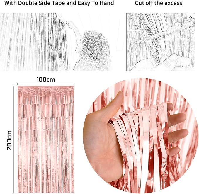 - 🎈 Rose Gold Party Decorations - You will get 2pcs 1m * 2m rose gold foil fringe curtain, 1pc rose gold birthday sash, 1pc rosegold birthday cake toppers, 1pc 18inch heart foil balloon, 1pcs 18inch star foil balloons, 1pc large crown foil balloon, 1pc happy birthday banner rose gold, 12inch balloons ( 8pcs rosegold latex balloons, 8pcs metallic rosegold helium balloons, 10pcs black party balloons, 4pcs rosegold confetti party balloons, 4pcs rosegold print balloons), 1pc balloon ribbon.