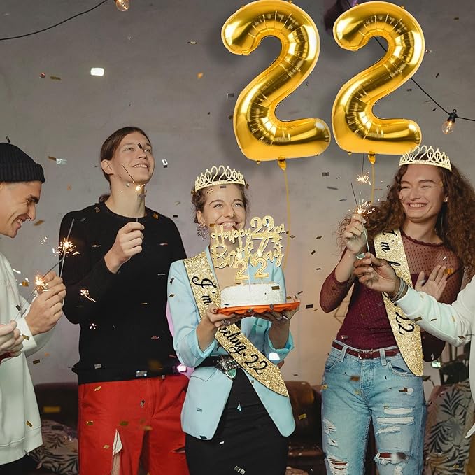 - 22 Year Old Birthday Gifts for Her: The kit includes Gold Glittery Rhinestone 22nd Birthday Tiara & Crown *1pc, Gold 22nd Birthday Sash *1pc, Happy 22nd Birthday Cake Topper *1pc, Number 22 Birthday Balloons *1set, Number 22 Birthday Candles *1set and a Classical Birthday Card. A classical birthday card included will help to write your love words to 22 year old girls. All these birthday accessories are packed in a thoughtful gift box