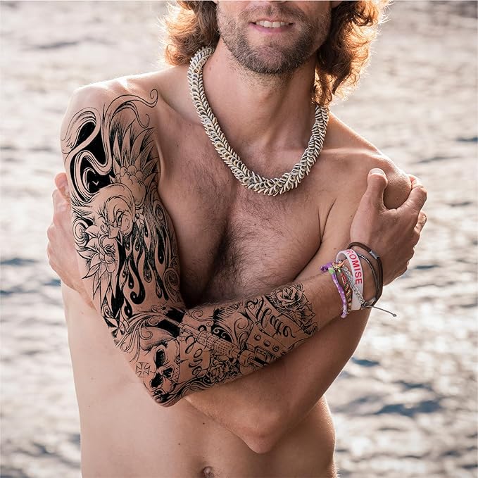 - ✔[QUICK & EASY TO APPLY] Remove Clear Film, And Water Transfer On Skin In 10-20 Seconds. It's Easy To Remove And Wash By Baby Oil Or Rubbing Alcohol. Long Full Arm Temporary Tattoo For Men Women Adults Sleeve.[Attention!] The Temporary Tattoo Paper Must Not Be Wet With Water In Advance, And The Fake Tattoos Sleeve Must Be Wet On The Body, Otherwise The Tats Sticker Will Not Stay On The Body For Long.