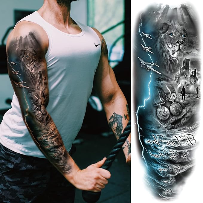 - ✔[LONG LASTING & WATERPROOF] Large Black Military Full Sleeve Fake Tattoos That Looks Real And Last Long For 3-7 Days Durable Fashion Designs DIY Customized Creative Temp Tattoos For Men Women Adult Gun Flower Plane Lion Campass Soldier Patriotic Military Theme Tatuajes Temporales Men Mangas Woman Para Resistentes Al Agu