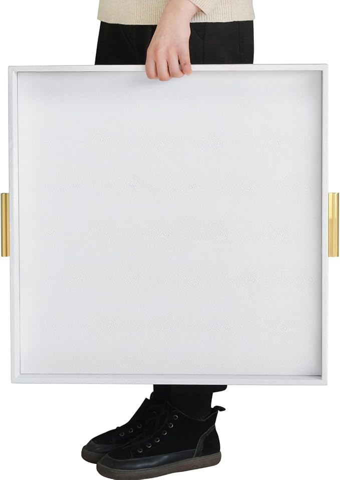 HofferRuffer Extra Large Square Serving Tray, Elegant Faux Leather Ottoman Tray with Gold Hardware Handles, Serve Tea, Coffee or Breakfast in Bed, 24 x 24 inches (White Shagreen)