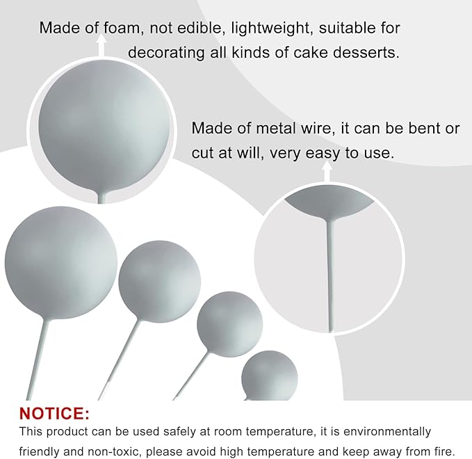- Material: these ball decorations for cake are made of foam and wire. Safe to decorate food at room temperature, such as cake and dessert decorating use, or cupcakes, fruits, cheese and any dish and appetizer you want to decorate.