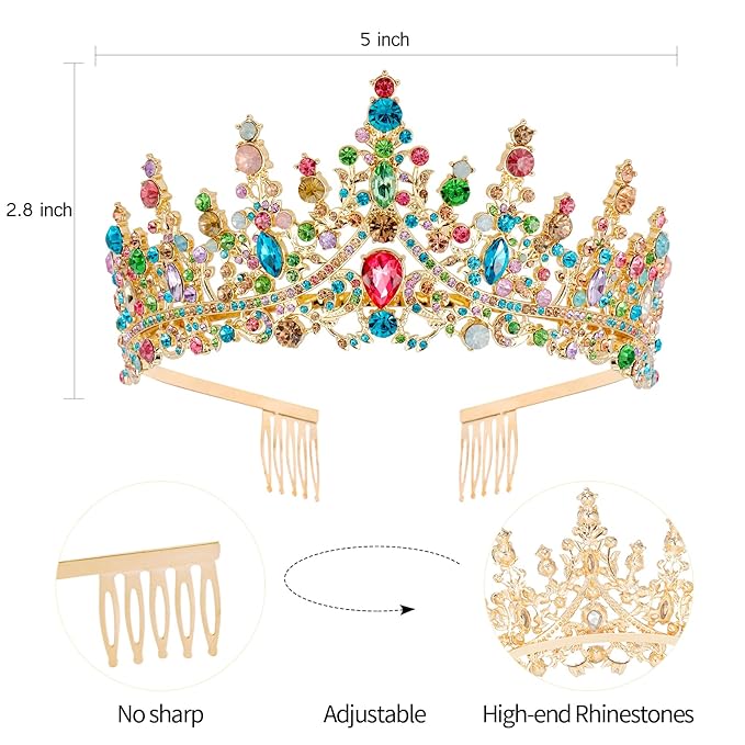 - Rhinestone Tiara: Made of high quality clear crystals in Gold-plated metal setting, eco-friendly. Perfect for any party use. It can also be used as a good photo prop, princess and queen style photos can be taken at any time. Besides, the end of the Crown headband has a comb for fixing the headband on your hair, preventing the slipping of the headband