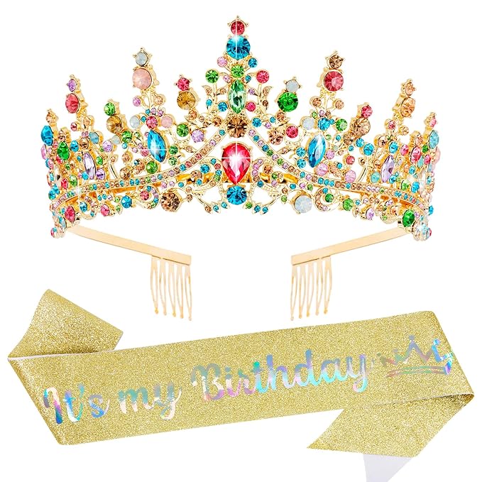 VELSCRUN Colourful Crystal Birthday Tiara Crowns for Women Girls It's My Birthday Sash Queen Girls Princess Crown with Combs Happy Birth Party Decorations Mom Sisters Birth Gift Hair Accessories