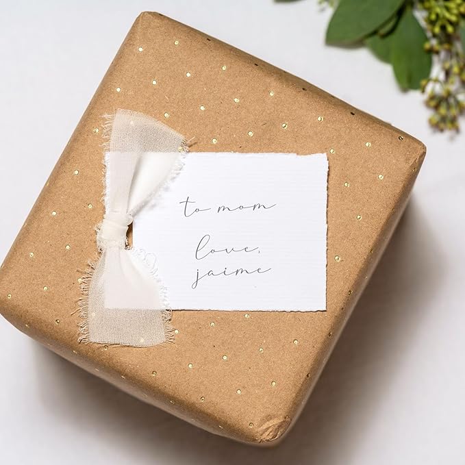 - Beautiful plain cardstock paper gift tags with ribbon and deckled edges that go beyond the basic for truly special occasions, table decor, place cards, favor tags and gifts. Based on traditional paper-making techniques, the laid paper texture and deckled edge mimics handmade paper for a more affordable price. Your personalized name tags are a keepsake item that are so pretty guests will tuck the name cards into purses and hang the placecards on their bedroom mirrors for years to come.