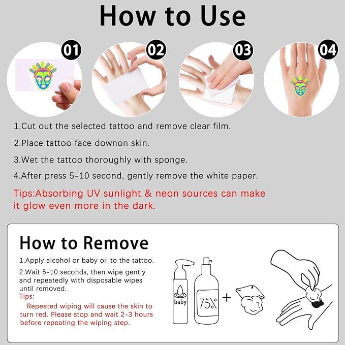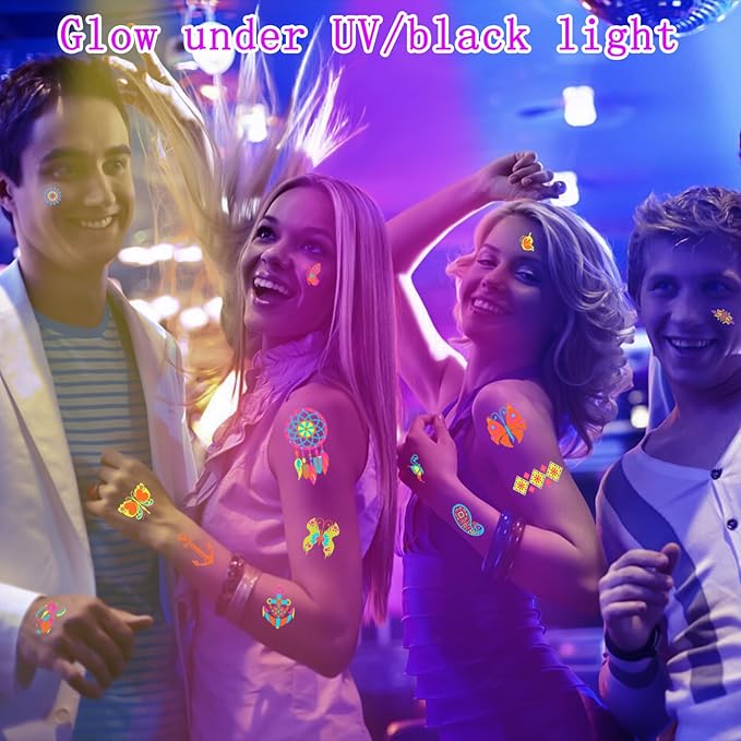 - Best Choice:UV neon light temporary tattoos use safe materials, are waterproof and last longer. Our fake tattoo stickers stick tightly to arms, face, waist, shoulders, collarbone and dry skin. Can be kept for more than a day and longer. Suitable for adults and children. Get it for fun!