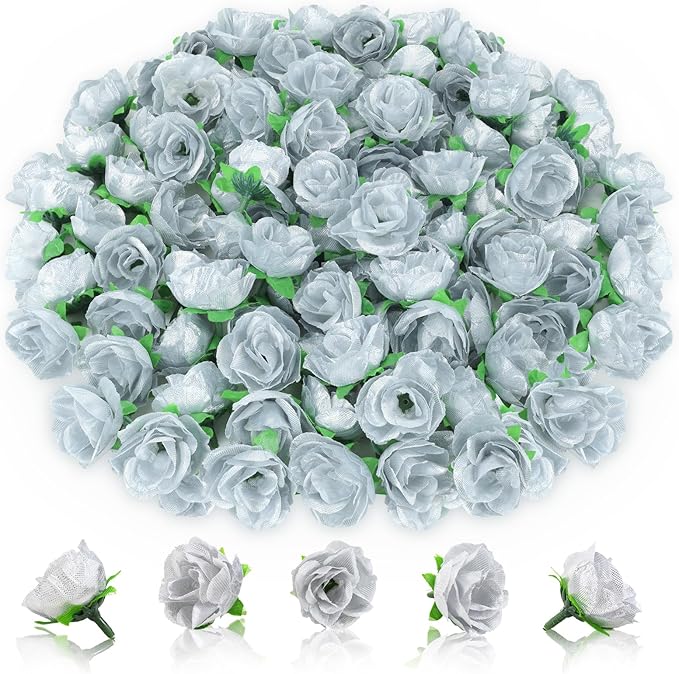 100pcs Silver Rose Flower Artificial Silk Rose Flowers Bulk Fake Silver Rose Flowers Heads for Crafting,Silver Rose Flowers for Centerpieces DIY Decorations