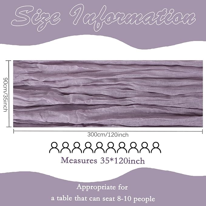 - 【Reusable】 These romantic table runners are made from polyester fabric with beautiful wrinkles. Soft feeling, reusable, , washable and fade resistant. The edges of the table runners are nice and cleanly sewn. These cheesecloth table runners are nicely sheer and the perfect grape purple to match the rest of the decor for party, adding a touch of romantic and elegant to your events.