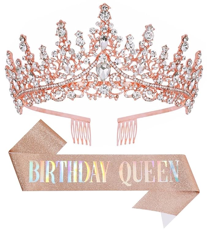 Birthday Tiara Crown with Sash for Women, Headband Hair Accessories for Wedding Party Costume Rose