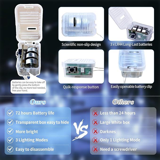 - UPGRADED DESIGH AND EASY TO REPLACE: The fairy lights' newest clear and small battery box is 0.78*1.32 inches in size, very easy to hide into all your DIY projects. The upgraded battery pack has scientific non-slip design on both sides, which makes it feel comfortable and easy to catch. Batteries are also very easy to take off, no more screwdriver needed, just gently press the bottom of the clip to open, free your hand