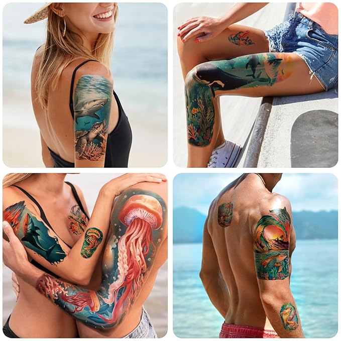 - UNIQUE DESIGN -- include Sharks, dolphins, turtles, jellyfish, octopus, sea fish, corals, beaches and other colorful underwater elements and more. Can be attached to various parts of the body, such as arms, shoulders, back, thighs, waist, etc. Our tattoo sticker for girls, teenagers, women, men, adults & kids