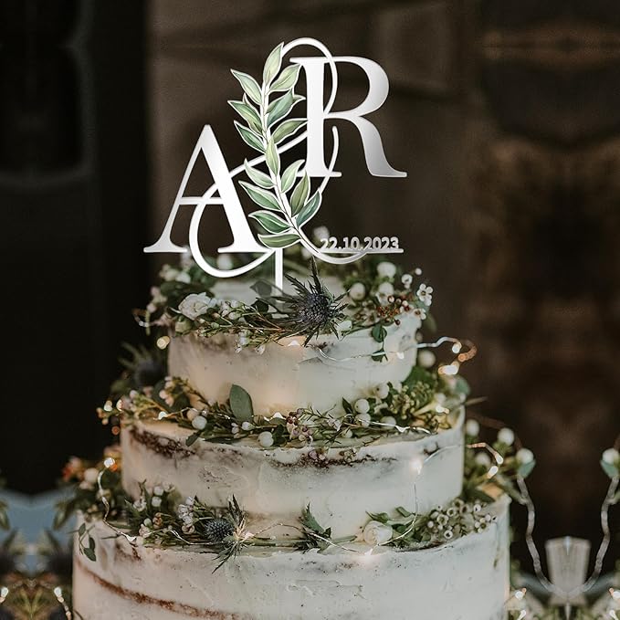 Personalized Wedding Cake Topper in Acrylic Custom Bride and Groom Initial Cake Topper Cake Decoration (Green Leaves)