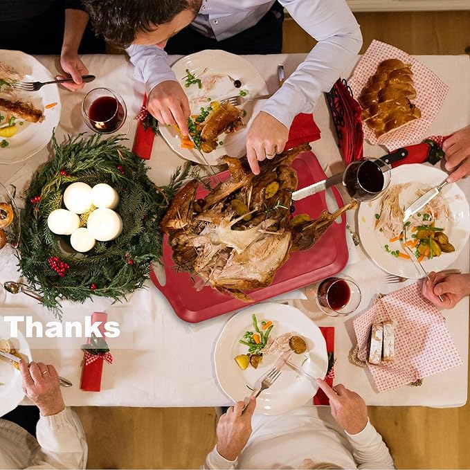 Extra Large Serving Tray with Handles, 20x13 inch, Set of 2 Melamine Platters for Serving Food, Turkey, Cookie, Rectangular Trays for Eating, Raised Dots Matt Finished, Dishwasher Safe, Red