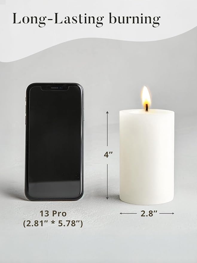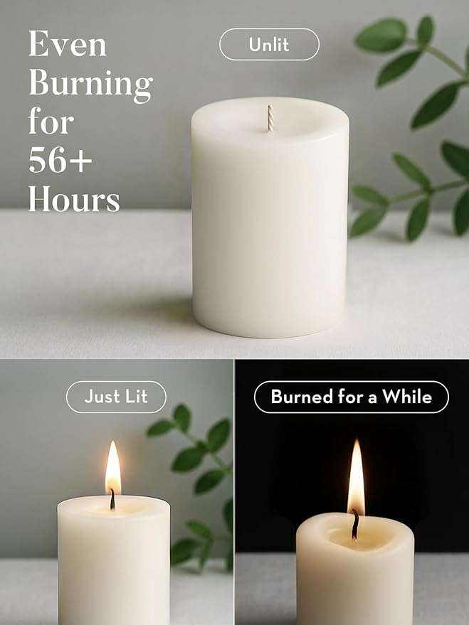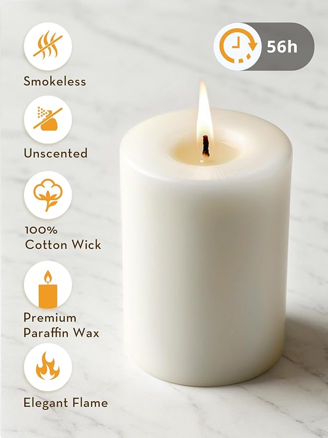 - Unscented and Dripless:Set of 3 white pillar candles. Enjoy a clean, dripless glow with smokeless wicks. Odorless design ensures a calm atmosphereCrafted for quality and lasting performance