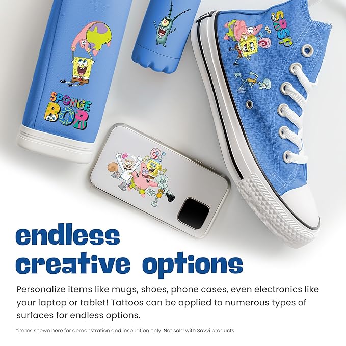 - DEEP SEA FUN: Embark on underwater adventures with 50 designs of beloved characters such as SpongeBob SquarePants, Patrick Star, Squidward Tentacles, brought to life through Savvi's Temporary Tattoos.