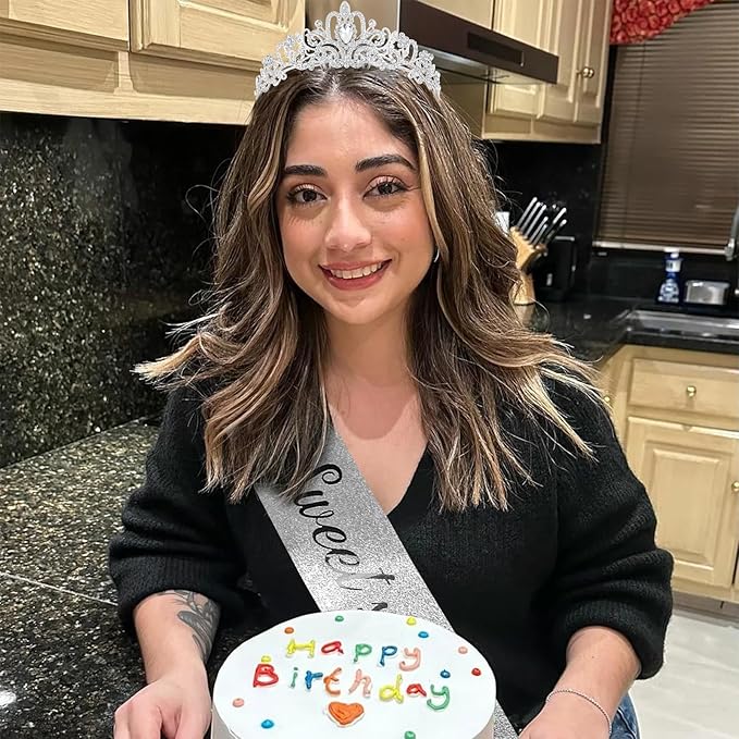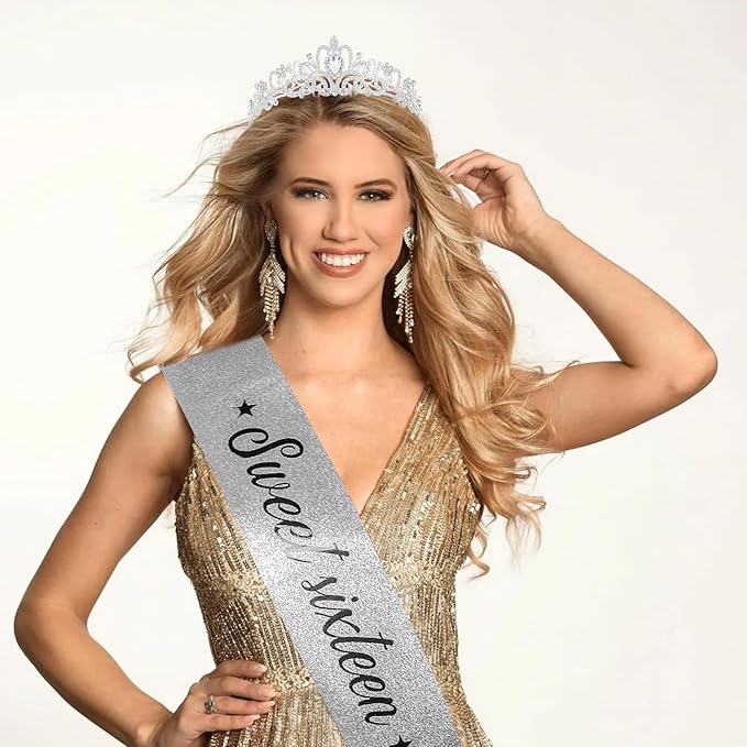- 【Nice Gift for Sweet 16】If you are still worried about what to give your friends for her birthday, this beautifully crafted crown and a glitter birthday sash will be an ideal choice. The tiara is elegant and atmospheric, with rhinestone embellishments that sparkle in the light. It is a nice hair accessories for girls. When your friend receives this birthday gift, it's sure to reward her with a pleasant surprise. Nice16th birthday gifts for girls.