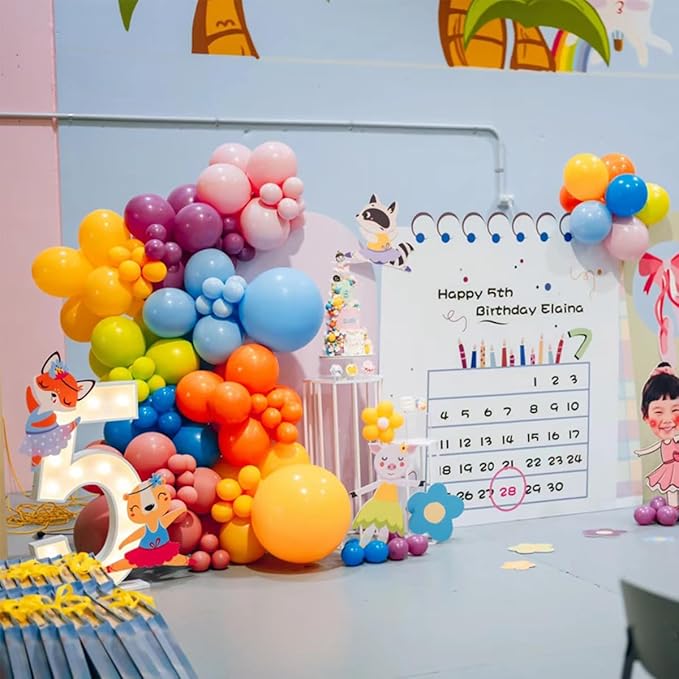 - 156 Pcs Balloons Arch Kit: Teal Blue Macaron Yellow Red Balloons Different Sizes (18" 6pcs, 12" 45pcs, 10" 45pcs, 5" 60pcs), White Tube Balloons (5pcs), Balloon Chain Tape (1 roll), Glue Dot (5 sheets), Balloon String (1 roll).
