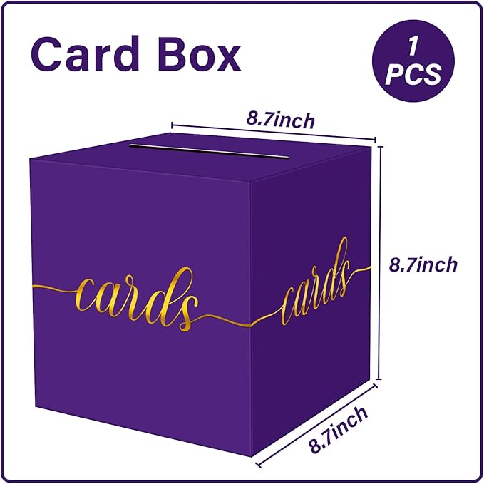 - 【Purple Card Box】The purple card box measure is 8.7 x 8.7 x 8.7 inch. The card box is large enough in size and has a card slot on the top, which can hold all kinds of well wishes cards, advice cards, gift cards, envelopes, lucky money and so on