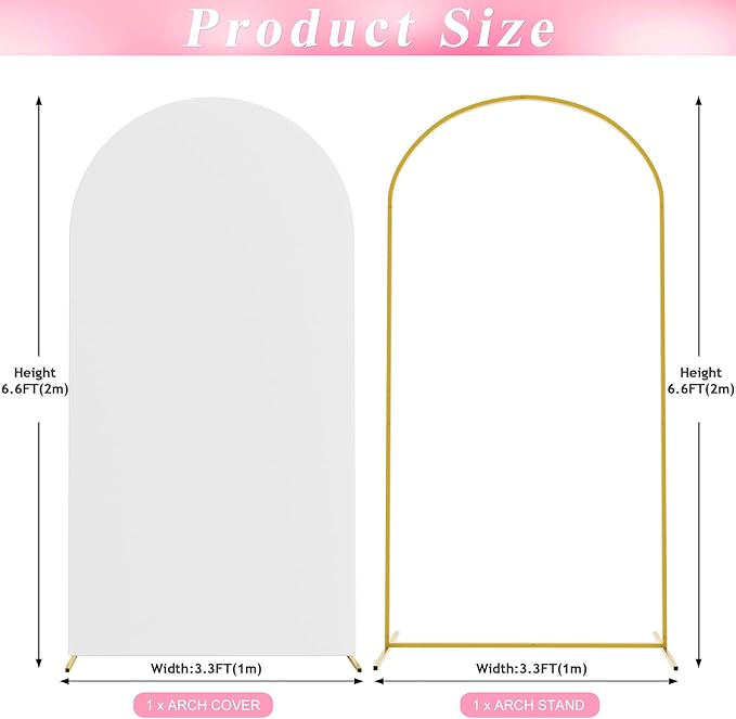 - 【Arch Backdrop Stand and Covers Package】Package contains 1pcs wedding arch stand and 1pcs arch cover. Size: 6.6x3.3ft(HxW). Material: metal arch backdrop stand and spandex arch cover. Color: White arch cover and gold wedding arch stand. Decorate your party with our gold arch stand and arch covers to create an epic decor for your celebration.
