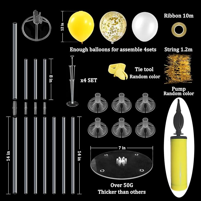 - WHAT INLCUDE: This balloon stand kit include 4 set balloon holders, 35pcs balloons - yellow white balloons and gold confetti balloons, balloon pump, ribbons, glue dots and tie tool