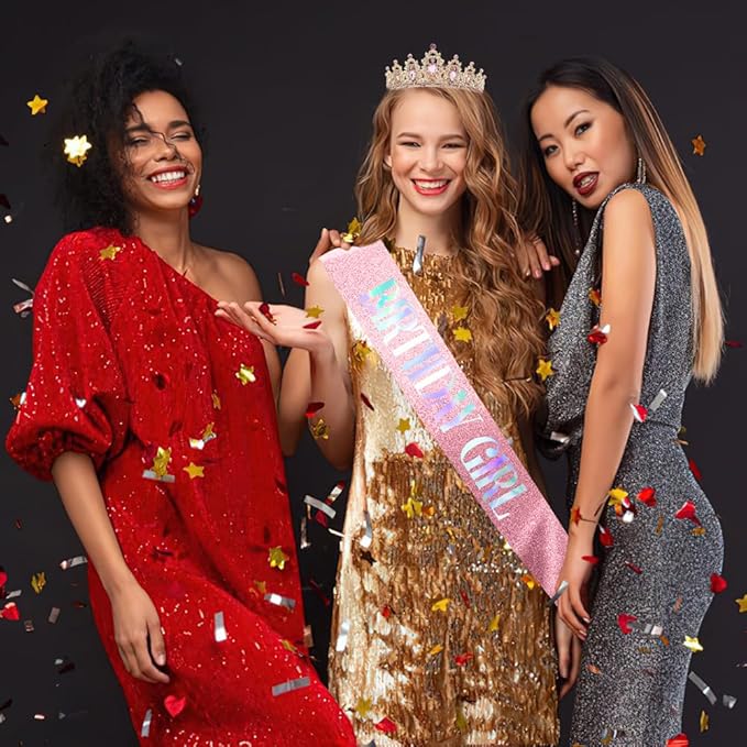 - Size and Material: 2.24"/5.7cm high, 5.32"/13.5cm in diameter. This tiara headband for women is made of high quality alloy with sparkling rhinestones, beautiful and sturdy. The color of the sash matches the headband with glitter and “BIRTHDAY GIRL” is printed on it, which is perfect for birthday parties.