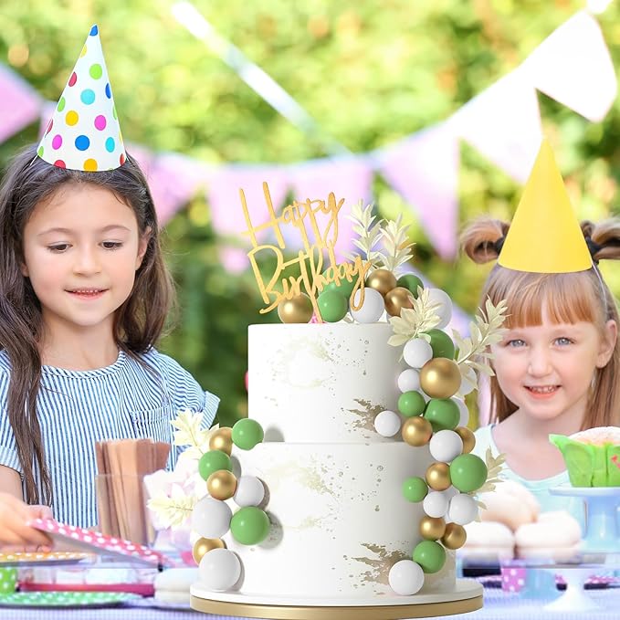 - Package included : 10pcs white grass cake toppers, 1pc happy birthday cake topper, 14pcs green balls, 14pcs gold balls, 14pcs white balls.