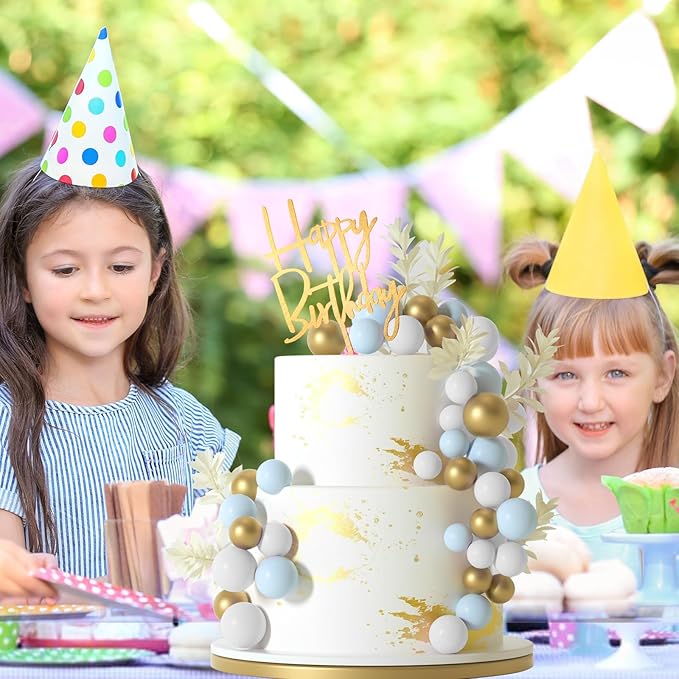 - Package included : 10pcs white grass cake toppers, 1pc happy birthday cake topper, 14pcs light blue balls, 14pcs gold balls, 14pcs white balls.