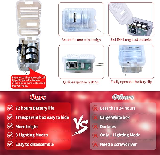 - UPGRADED DESIGH AND EASY TO REPLACE: The fairy lights' newest clear and small battery box is 0.78*1.10 inches in size, very easy to hide into all your DIY projects. The upgraded battery pack has scientific non-slip design on both sides, which makes it feel comfortable and easy to catch. Batteries are also very easy to take off, no more screwdriver needed, just gently press the bottom of the clip to open, free your hand