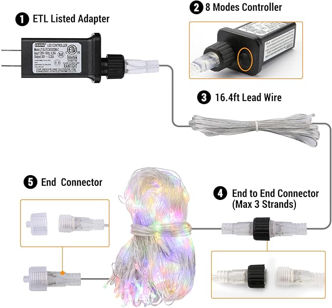 - 【Safe to Use & Easy to Install】The output voltage of the net Christmas lights is 30V and plug have been certified by UL to ensure & maximize the safety.Step1-Place or hang the mesh string lights on any other occasions in seconds to finish your decoration. Step2-Plug the transformer into the main supply and power the Christmas fairy twinkle lights on, then you can choose the mode by the button on the power adapter