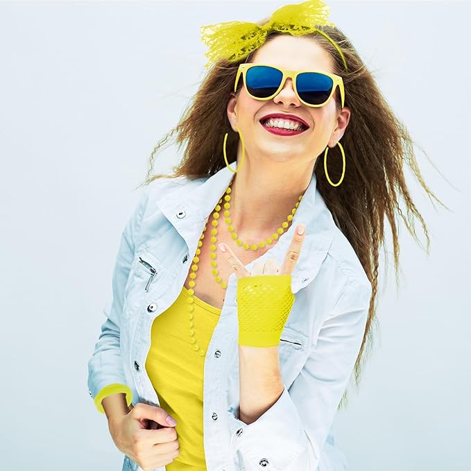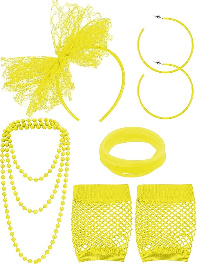 - Package Includes: 80s party supply includes 1 pair fishnet gloves, 1 pair vintage earrings and 1 piece headband, 1 piece necklace and 10 pieces silicone bracelets; Meet you demands for 80's costume accessories and Halloween
