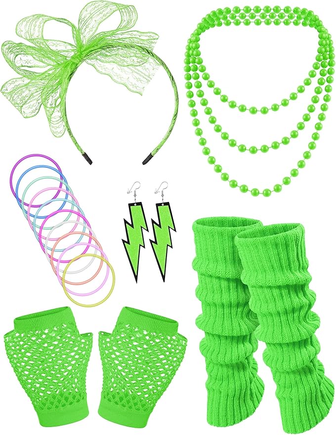 - Package includer:lace headband*1, vintage earrings*1 pair,neon fishnet gloves*1 pair,necklace*1,silicone bracelt*10,leg warmer*1 pair,6 piece set green 80s accessories outfits for women.