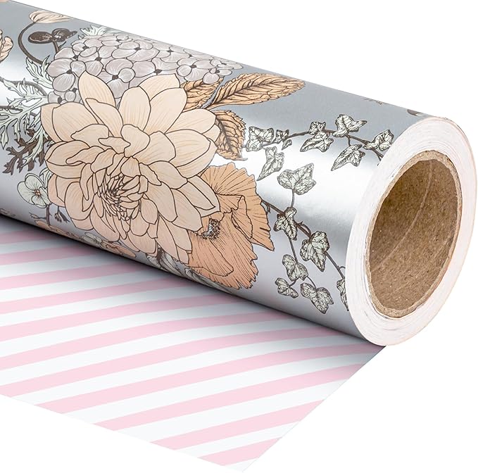 - REVERSIBLE: Beautiful vintage floral printed on silver pearlized paper on one side, pink and white stripe patterns printed on the reverse. Two different designs make unique and varied gift presentations easy.