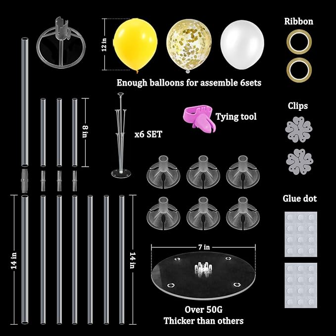 - WHAT INLCUDE: This balloon stand kit include 6 set balloon holders, 54pcs balloons - yellow and white balloons, gold confetti balloons, 2 pcs balloon clips, 2 rolls ribbons, 2 pcs glue dots and 1 pc tie tool