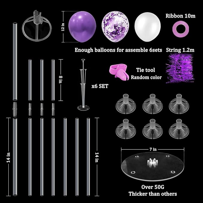 - WHAT INLCUDE: This balloon stand kit include 6 set balloon holders, 54 pcs balloons - purple and confetti balloons, white balloons, 32 feet ribbons, 2 sheet glue dots, 1 purple string, 1 tie tool