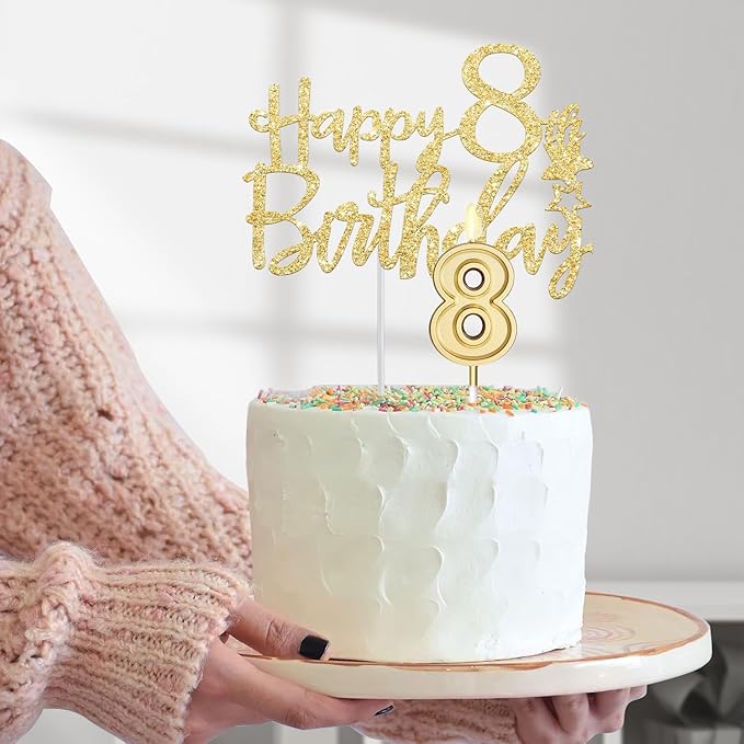 - 8th Birthday Cake Topper and 8 Candle: Gold 8 Birthday Candle which is packaged in a separate plastic box. A glittery Happy 8 Birthday Cake Topper Gold is a funny choice for princess theme birthday party decorations. They are good to embellish the cake and cupcake. Bright glow for creating happiness atmosphere and adding much fun in your princess baby birthday party